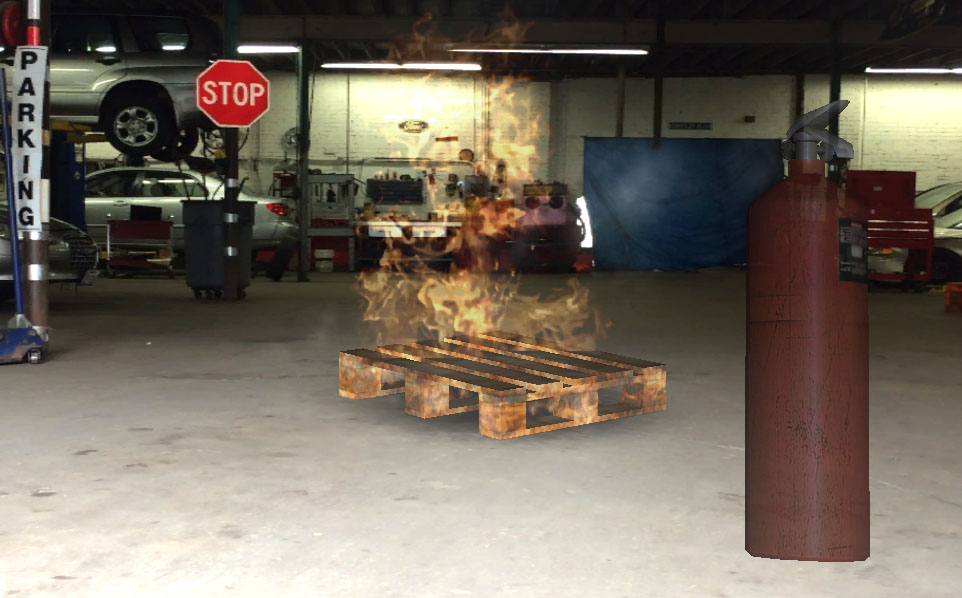 During the prototype stages of the project, we built a similar experience for the HoloLens, where a pallet fire would be placed in the real world using Augmented Reality and a trainee would use a virtual fire extinguisher to extinguish the fire. The benefits of this is that you can practice each scenario in the actual location that a real-world fire would occur. However, this approach does have added complexities and lacks the immersion that Virtual Reality provides. Ultimately our client ended up going for the Virtual Reality approach.